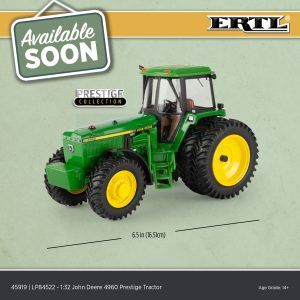 • Replicated in 1:32 scale, this John Deere 4960 tractor features Prestige type details including die-cast wheels, a detailed cab interior (with clear plastic windows) and a poseable three-point hitch.