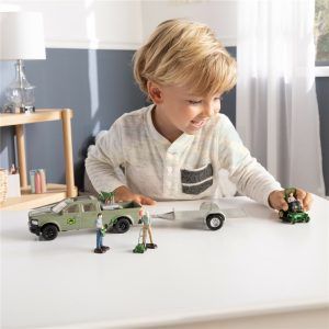 • This 15-piece set features a die-cast John Deere Zero Turn lawn mower, removable toolbox for truck bed, sitting figure that fits inside the truck and riding mower and 2 standing figures that hold and "use" the tools.